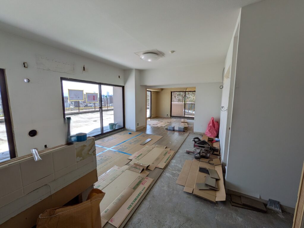 フローリング、壁紙の張り替えをしております。キッチンは上部吊り戸棚を撤去し、チャコールブラックのオープンカウンターキッチンを設置します。開放感のある明るいLDKになります♫